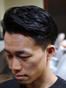 こちらはスキンフェードですが、上をツーブロックにしてラインを入れないことで柔らかい印象を演出しています。