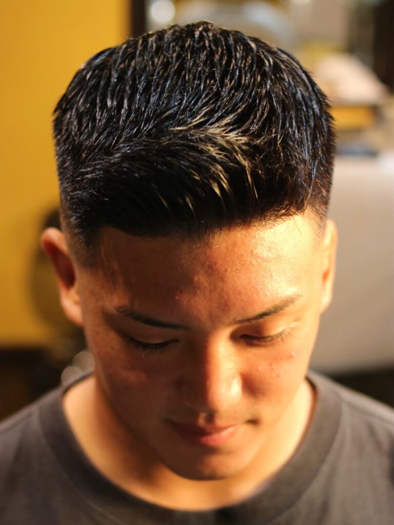 やはり第一印象で好感触を得る鉄板は短髪でオデコが見えてる事だと大事です!就活生の皆さんには写真の様にスキンフェードではなく、ある程度刈り上げに厚みを残すのをおススメします!